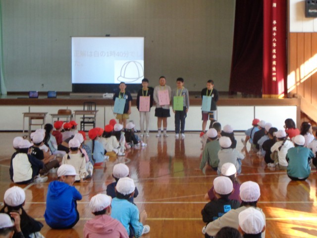 10月30日(木)児童集会で放送委員会、図書委員会の子どもたちが委員会の活動内容をクイズやロールプレイなどを駆使して、わかりやすく楽しく発表してくれました。これからの活動が益々楽しみになりました。子どもたちの主体的な取り組みに期待したいです。
