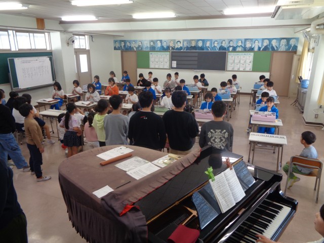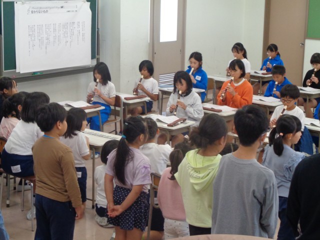 11月4日(火)5年生による昼休みコンサートを開催しました。この日に披露した2曲はいずれも音楽の授業で頑張っ仕上げてきた合唱「夢の世界」と合奏。大変上手に発表することができました。5年生のすてきな歌声や合奏に魅了され、癒やされるひと時になりました。