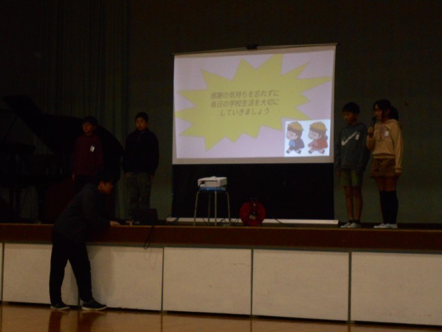 2/26(木)に「感謝の集い」の児童集会を行いました。代表委員会が、時間をかけて話し合って企画した集会で「地域の方、親、先生など私たちの学校生活を支えている方々に[ありがとう]を伝える会です」と全校に伝えてくれました。そして各学年の代表者による感謝の作文発表のあと、校長先生が、「ありがとう」は、「有り難し」、「ありがとう」の反対言葉は「当たり前」という言葉の意味から「ありがとう」を伝える大切さを分かりやすく話してくださいました。