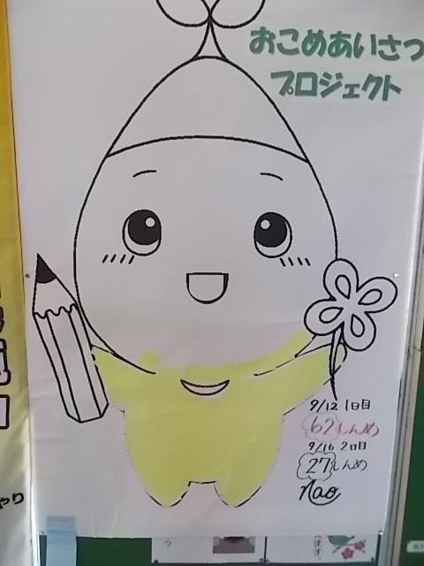 9月16日(火) おこめあいさつプロジェクト(2日目) 公開日 2025/09/16 更新日 2025/09/16 学校の様子 おこめあいさつプロジェクト2日目は、27枚の色紙を貼ることができました。しんめちゃんの体がシールでいっぱいになりました。明日も自分から積極的にあいさつをすることができるといいですね。
