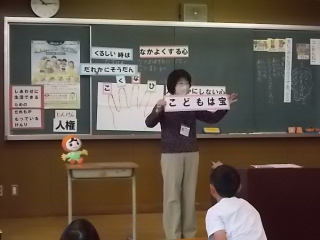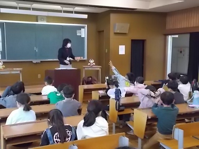 紙芝居のお話から相手の気持ちを考えて行動することの大切さを考えたり、5本の指の呼び方に自分や相手を大切にするメッセージをつけて意識付けしたりするなど、2年生にとってわかりやすいお話になりました。