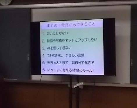まとめとして、①会いに行かない、②動画や写真をネットにアップしない、③AIを信じすぎない、④ていねいに・優しい言葉、⑤夜ちゃんと寝て、朝自分で起きる、⑥家庭のルールをいっしょに考える、⑦夜9時過ぎには友達とゲームやSNSをしない、とお話しいただきました。