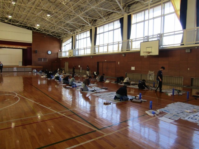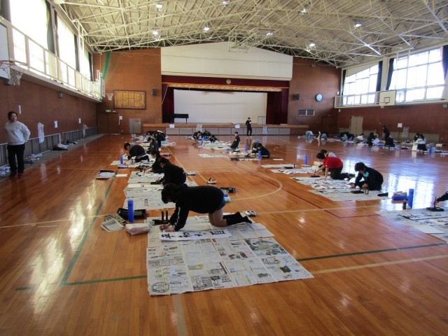 今日は5年生が体育館で書き初めをしています。