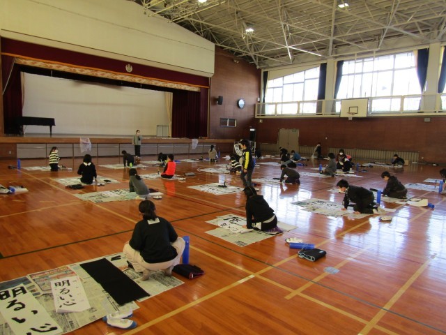 目を閉じ、心を落ち着かせてから、書き初めを始めました。