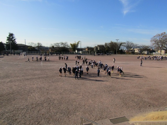 児童は校庭に散らばり、音楽が鳴り止んだら近くの人とじゃんけんをして、列を作っていました。