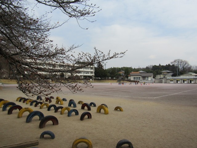 桜の木を見ると、数輪開花していました。校庭では1年生が元気よく活動していました。
