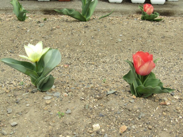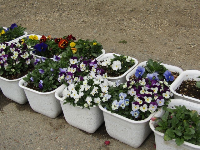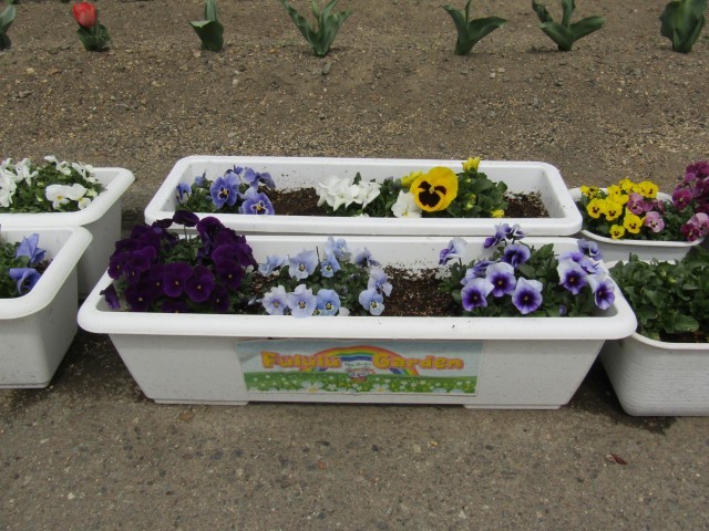 花壇には1年生が育てているチューリップが。通路では卒業式で飾るパンジー・ビオラが咲いています。2年生と環境美化委員会が育てています。