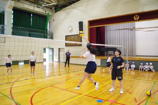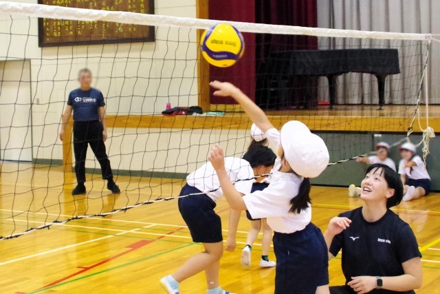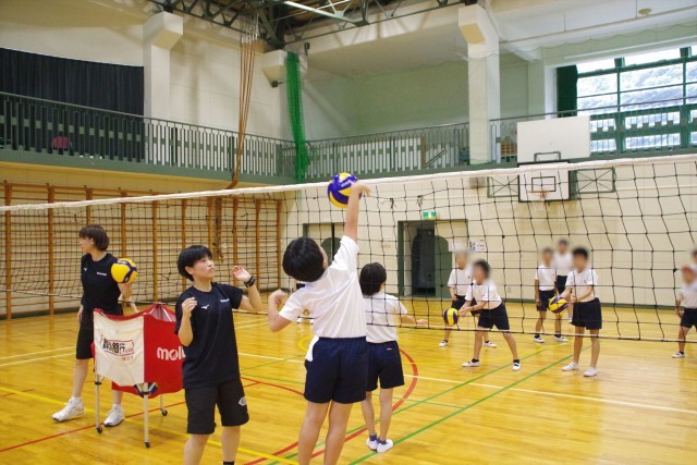 9月17日(水)の午後、群馬グリーンウイングスのスタッフの方が来て、なんとバレーボール教室をしてくれました。体育の先生のアレンジで実現しました。ゼネラルマネージャーの齋藤さん、ジュニアチーム担当の3人のスタッフさんが来て、たっぷり1時間半指導を受けました。齋藤さんは女子バレーボールの元日本代表でした。本当は5,6年生の体験教室でしたが、せっかくの機会ということで1~3年生も見に来ました(4年生は午前に校外学習だったため、ご辞退)。