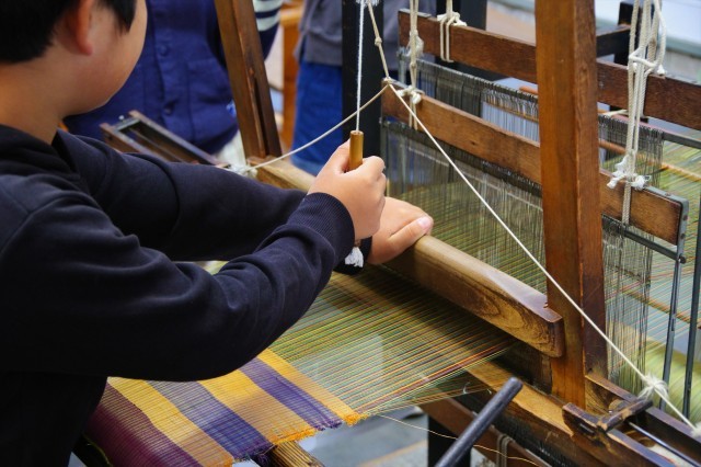 まず訪れたのは、「織物参考館『紫(ゆかり)』です。桐生織の学習ができるように、元森秀織物さんの一部の工場をリフォームして博物館になっています。のこぎり屋根が特徴のレトロな工場です。ここでは、ビデオで学習した後、手織りの織機から全自動の織機まで展示してある会場を見学しました。数人の子が織物体験をしました。ここでのメインイベントは藍染め体験です。事前に輪ゴムで絞りを付けてきたハンカチを瓶に入った染液で染めます。「瓶に落っこちるなよ~」と何度も担任の先生から言われてきましたので、みんな慎重にに染めます。広げてみると個性豊かな藍染めハンカチができあがりました。