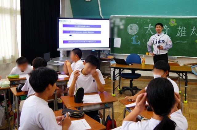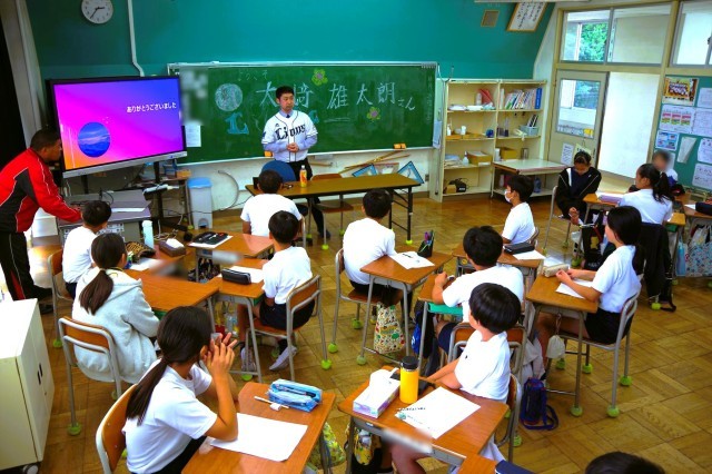 10月24日(金)の午後、元西武ライオンズで活躍した大﨑雄太朗さんが6年生の教室にやってきて、授業と野球教室をしてくれました。これは、6年生の保護者の方がちょうど大学時代に大﨑選手の親しい先輩で、声をかけたところ実現したものです。大﨑選手は2007年から十年ほどライオンズに在籍し、投手大谷選手とも対戦し、ヒットも打ったことがあるそうです。引退から8年たった現在は全く新しい「経営コンサルタント」の仕事が軌道に乗り、活躍なさっているそうです。