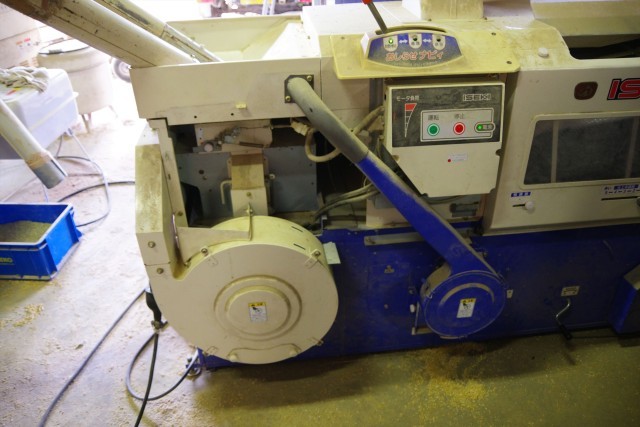 工場には乾燥機と振動型籾摺り機という大きな機械があって乾燥した籾から籾殻を取る作業ができるそうです。籾摺り機は籾同士をぶつけ合って籾殻を取り、振動させることによって殻とお米に選別しているそうです。殻が取り切れなかった籾はまた戻され、ぶつけ合って殻を取り、これを繰り返すことですべての米の籾摺りができるということです。複雑な過程ですが、半俵(30kg)の米をものの数分で籾摺りしてしまいました。