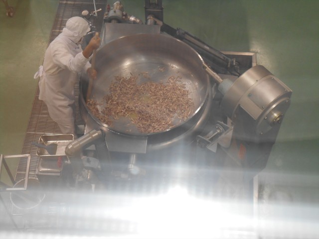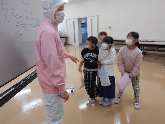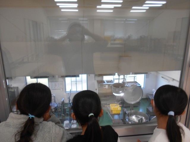 10月29日(水)は2年生が生活科で町調べをしている関係で、毎日おいしい給食を作ってくださっている「桐生市学校給食 新里共同調理場」に見学に行きました。まず、場長さんから説明を受けたあと2階の窓から調理風景を見学します。この日のメニューはみんな大好き・揚げパンとスパゲッティナポリタンです。大きな鍋にけっこうな量のベーコンが投入され、調理員さんが力一杯かき混ぜています。底へ大量の野菜類が入り、野菜炒め状態になりました。隣の鍋ではトマトソースでオレンジ色の温泉のようになっていました。