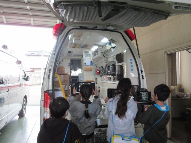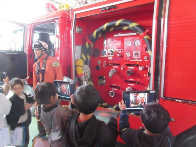 駐車場に移動して消防士さんの装備や消防車や救急車の見学をしました。途中で本当に救急車が出動する場面も見ることができました。消防士さんは消防車の中に入っている物や救急車の中の装備についてたいへん詳しく説明してくれました。