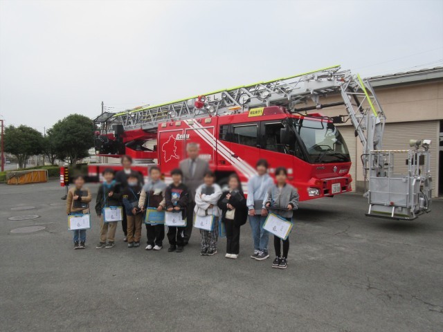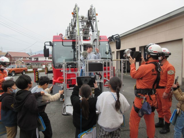 最後はいよいよはしご車の見学です。教頭先生がゴンドラに体験乗車させていただきました。地上35m(約12階)まであげていただいた時は本当に足がすくんだそうです。そして、はしご車のかごの部分に乗せてもらって(上昇は無し)、一人一人記念撮影をしてもらいました。