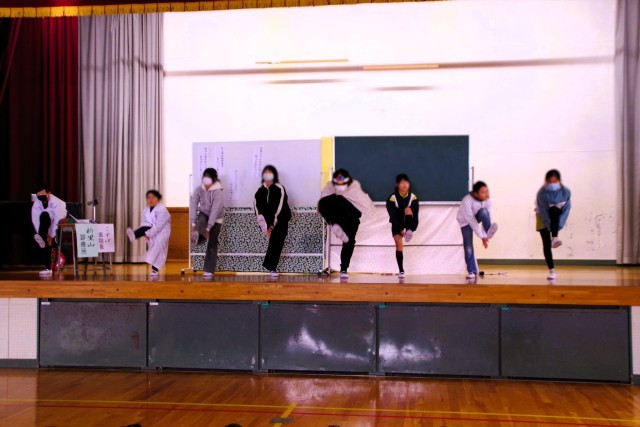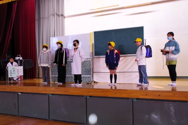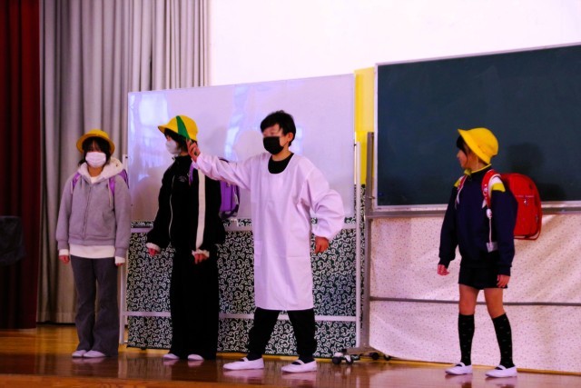 12月10日(水)の朝の活動は、児童朝会「保健委員会の発表 薬を飲むのはどんなとき?」でした。先日お伝えした学校保健委員会で披露した「薬物乱用に気を付けよう」の劇を子どもたちに発表しました。今回は観客が子どもたちなので、笑いを誘いながら物語が進みました。病気の子に薬を飲むコーラを渡したり、薬剤師さんがタイムスリップできるスリッパを振り回したり、病気の子が薬を飲み過ぎて気絶してしまうところなどがウケていました。