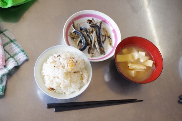 あれ、おかずはないですね。「煮干しをおかずにして食べよう」と誰ともなく言い始め、多くの子が煮干しの出し殻をつまみながらごはんを食べていました。ちょっとお裾分けをいただきましたが、しっかり出汁のきいたおいしいみそ汁でした。ごちそうさま。