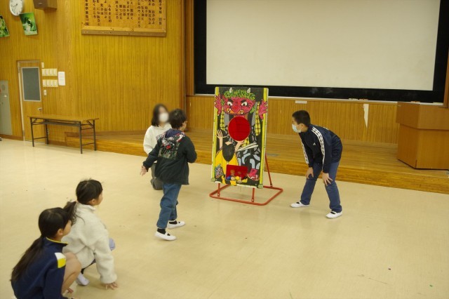 最後は、先ほどのクラスの追い出したい鬼を丸めた大きめな玉を代表者が投げます。だいたいぽーんと投げて鬼の腹に投げ入れたのですが、野球をやっている6年生の男の子は食堂の一番後ろから投げました。鬼の上空を飛んでいったのですが、最後はとても盛り上がりました。6年生ありがとう。