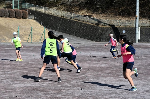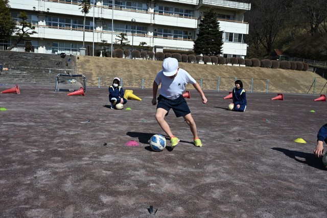 3時間目は個人技の練習です。ドリブルで追いかけっこをしたり、チーム対抗でカラーコーンに的当てをしたりして、ボールの扱い方に慣れるための練習をしました。サッカーを習っている男の子は、巧みなボールコントロールで、おにの藤井さんから見事に逃げ切りました。