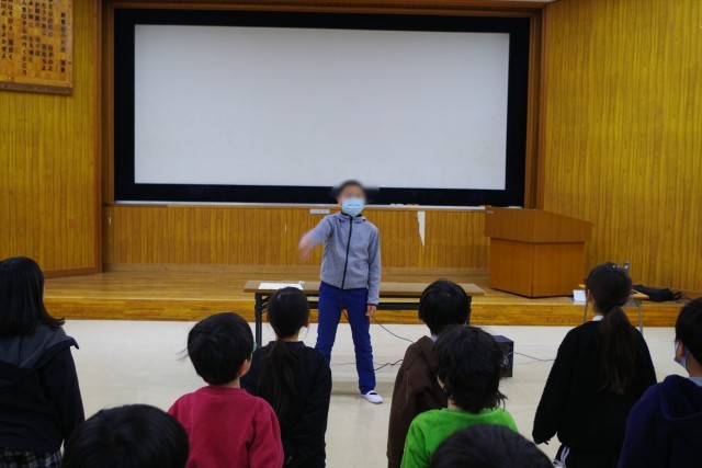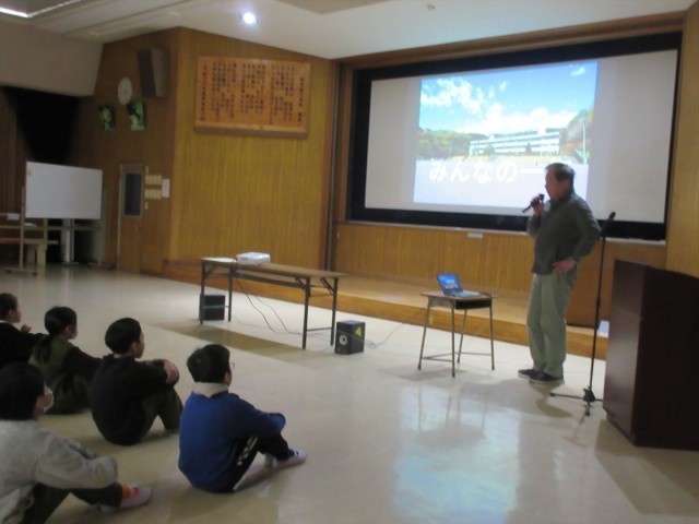 校長の話は、この一年を振り返る写真のスライドショーを見てもらいました。「あー、あれやったね」「あそこも行ったね」と子どもたちのつぶやきが聞こえてきます。ユニークなポーズをした写真のときは、「わぁ」と歓声が聞こえました。良い表情の子どもたちが多い学校で、気持ちが良いです。