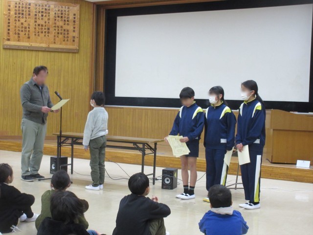 表彰伝達は県のなわとび競技会でたくさん賞をもらったので、それを渡しました。二重跳び150回クラスの子が二人もいます。三重跳び20回クラスの子も4人います。毎日練習したかいがありましたね。