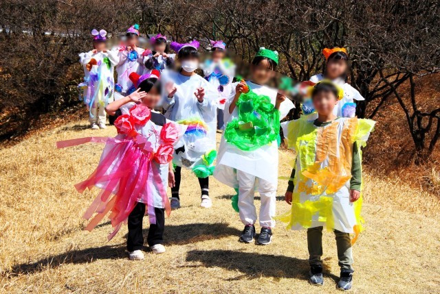3月12日(木)の4時間目、2年生が工作で作った衣装を着てファッションショーをするというので、見に行きました。白いビニール袋にすずらんテープやお花紙をつけて、賑やかな衣装になっています。コンセプトは「どうぶつ」で猫が多かったかな。あと、カメやキツネ、リスなどもいました。