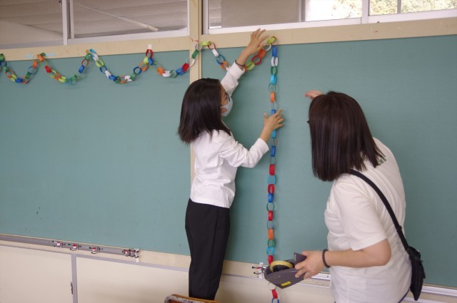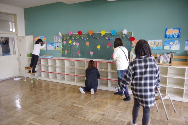 この日の作業は、①机と椅子を新しいクラスに合わせて移動すること、②新しい教科書を配りやすいようにクラスに運ぶこと、③1年生の教室をきれいに飾ること、④入学式仕様に体育館をデコることなどです。各班にに分かれて担当の先生の指示に従ってみんなテキパキと動いていました。そして、1年生の教室も、体育館も大切な新1年生を迎えられるよう準備が整いました。