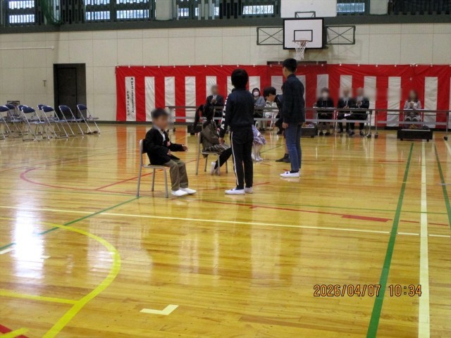 新任式・始業式に続いて、午前10時30分より入学式を行いました。今年の新入生は男子1名、女子2名の計3名です。6年生のおにいさん、おねえさんに手を引かれ、広い北小学校の体育館に入場してきます。みんなが座っても非常にゆとりがありますね。校長からは前にも話した授業の3匹のカエル「かんがえる」「まちがえる」「ふりかえる」をたくさん発揮してがんばってください、というような話をしました。みんなこっちをしっかりと見て、話を聞いてくれていました。