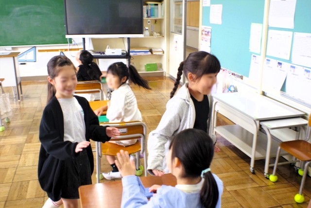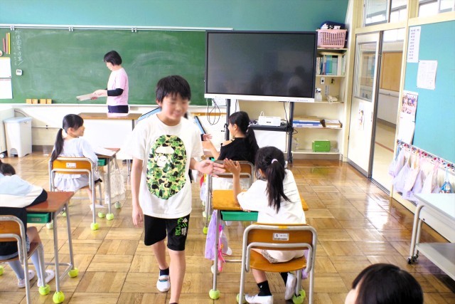 最初に職員室に寄って、仕事をしている先生達にあいさつします。そして、分担して各教室を巡ります。教室では一人一人にハイタッチをして回ります。このような児童活動のおかげで、北小の子はよくあいさつできる子に育っているのですね。
