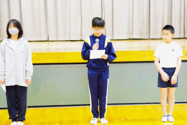 保健委員会での仕事は、みんながおいしく安全な水を飲めるように毎朝水質検査をしています。 元気に学校生活を送れるように、健康観察表の集計を毎日しています。学校生活を安全に送れるように、毎週月曜日に清潔調べをして結果を発表しています。皆さんにお願いがあります。手洗いうがいを欠かさずにしてください。ハンカチ、ティッシュ詰めは健康な生活に大切なものなので、毎日身につけておきましょう。怪我をしたら水道の水で洗ってから来てください。これで保健委員会の発表を終わりにします。