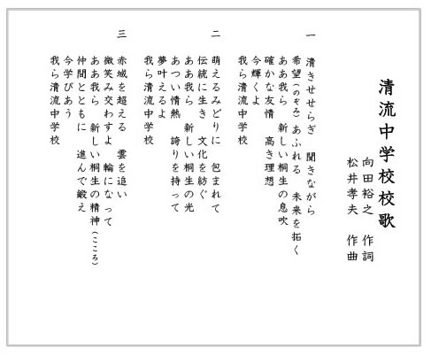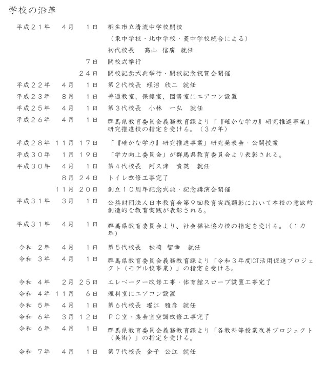 桐生市立清流中学校は、東中学校・菱中学校・北中学校の3校が統合して平成21年4月1日に開校した学校です。令和7年度は17年目となります。