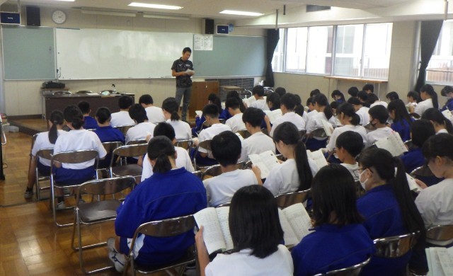 9月24日(水)6校時、1年生が高原学校のしおり学習を行いました。いよいよ来週に迫った高原学校ですが、完成したしおりを手に取り楽しそうに中を確認していました。学年主任から、日程や持ち物の確認、注意事項などが伝えられました。特に、「自分で責任を持って持ち物を準備すること」、「しおりをしっかりと読み込むこと」を強調していました。楽しい高原学校にするために、体調を整えしっかりと準備して当日を迎えてほしいと思います。