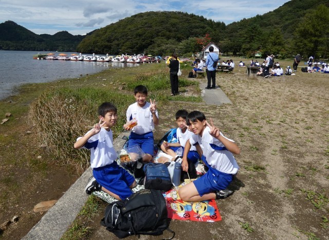 初日に榛名富士をバックに昼食を食べたときの様子です。午前中、榛名神社を散策したあと榛名湖畔のビジターセンター付近で昼食を食べました。これから高原学校に入校し、カッター実習やキャンプファイヤーなどを行います。まだまだ元気でカッター実習を楽しみにしている様子でした。
