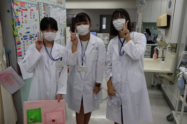 2年生職場体験学習の様子。消防署、自衛隊、病院関係の体験学習の様子です。普段はあまり目にすることのない業種のお仕事に関わることで、常に人々のために働く仕事の尊さや大変さを実感し、自分たちの平和な日常は当たり前ではないと気づくことができました。