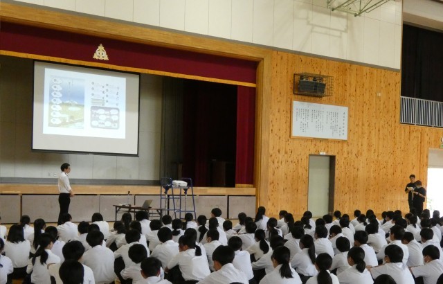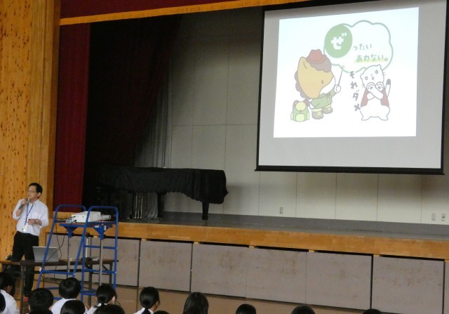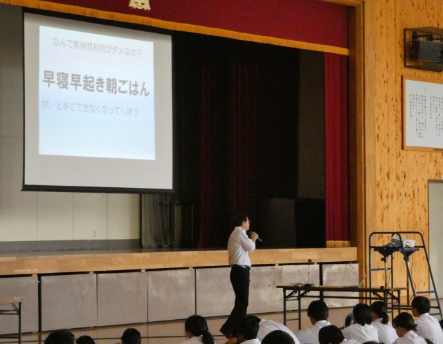 10月9日(木)6校時、情報モラル講習会(PTA教養委員会の家庭教育学級を兼ねる)を行いました。生徒たちは中間テストを5時間受けた後、体育館で丸山道慶(NPO法人ぐんま子どもセーフティーネット)さんのお話を聞きました。