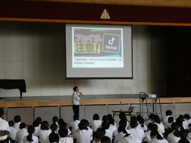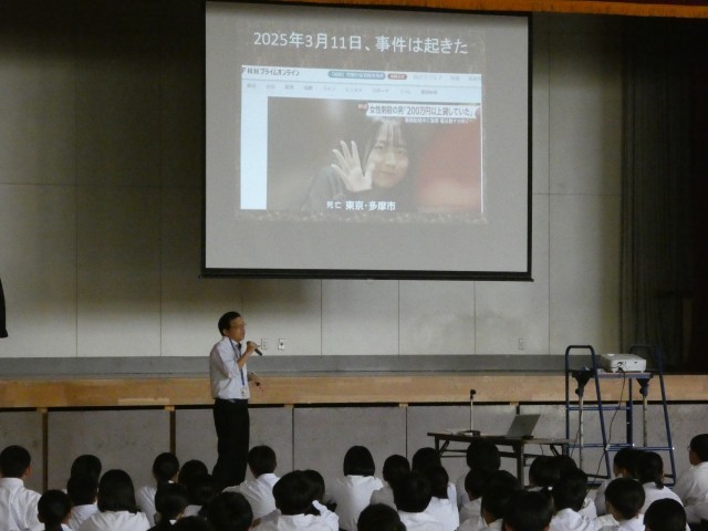 情報モラル講習会は毎年開催されておりますし、生徒たちはいろいろな場面でインターネットやSNSの使いすぎによる危険性について学んできています。しかし、話の内容は毎年少しずつ変わってきている印象を受けました。今回は中学生を取り巻くネットトラブルの現状とその影響を具体的な事例とともに学ぶ機会となりました。丸山さんは生徒たちに「あなたはどうしたいのか?」「どう行動するべきなのか?」と問いかけ、直接的に強いメッセージを伝えてくれました。深夜までSNSで誰かとつながり寝不足になることは健全な生活を送ることができない。つまり、「基本的なことであるが、『早寝、早起き、朝ごはん』が大切である」と改めて教えられました。生徒一人一人が情報を正しく判断し、相手を思いやる行動を選ぶ力を身につける重要性を実感しました。講習会の最後にPTA教養委員会委員長様(保護者代表)から謝辞が伝えられ、講習会を締めくくりました。丸山様、大変勉強になる貴重なお話をありがとうございました。