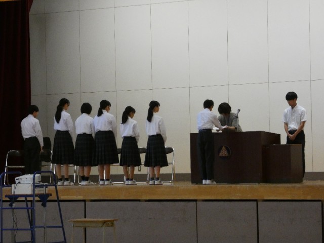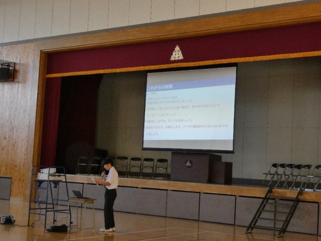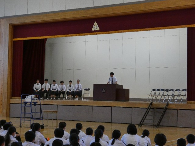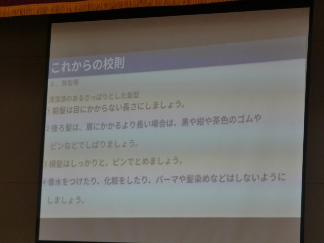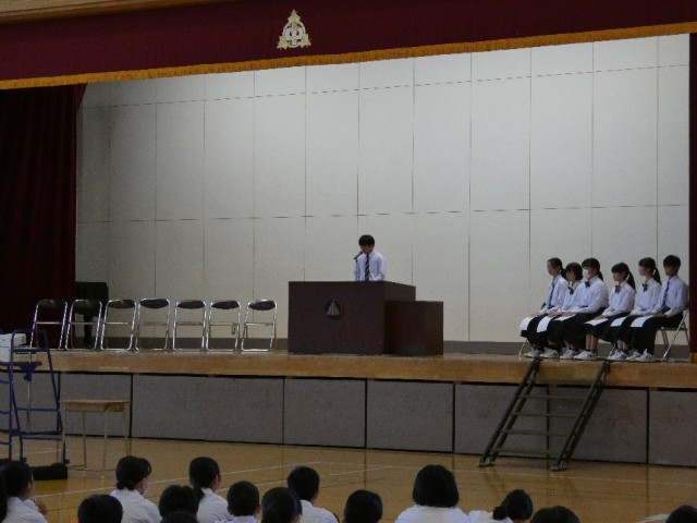 最後に旧生徒会長から校則(髪型)の見直し案の試行期間が終わるので、改めて校則(髪型)についての説明がありました。最後のお仕事でした。旧生徒会本部役員の皆さん1年間お疲れ様でした。