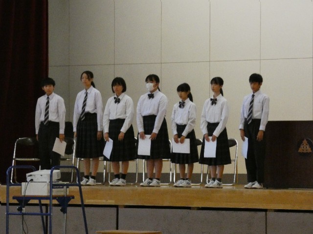 10月17日(金)1校時、旧生徒会本部役員の退任式と新生徒会本部役員の任命式を行いました。旧の方々は退任のあいさつを行い、「大変なこともあったけど、仲間や先生方が支えてくれた。」「全校レクや学校紹介動画の作成に尽力した。」「何より自分が成長できた。」と1年間の生徒会本部役員としての活動を振り返り、自分の成長を実感することができたことを伝えてくれました。新の方々は、校長先生から委嘱状を受け取り、気持ちを引き締めていました。先輩からのバトンをしっかりと受け継ぎ、清流中をより良くするために仲間と協力して活動してほしいと思います。新生徒会長から「頑張ります!」と頼もしい言葉が聞けました。
