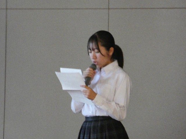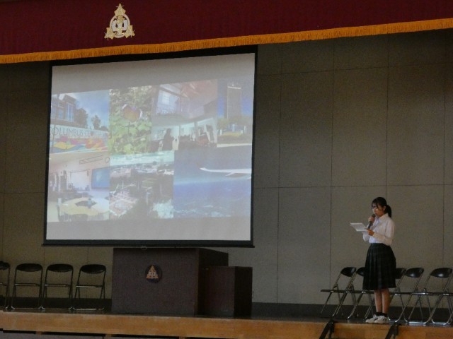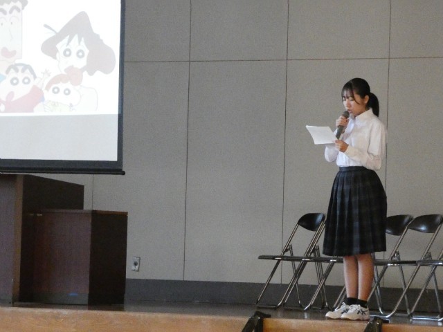 生徒会本部役員の退任式・任命式の後、中学生海外派遣事業の報告会を行いました。3年生のMさんは、8月22日〜28日の6日間、桐生市の姉妹都市であるアメリカジョージア州コロンバス市に海外派遣としてホームステイやミドルスクール訪問、市内視察等を経験しました。現地でのホストファミリーさんとの交流の様子や、現地の中学校を訪問した時の素直な感想、日本とアメリカの違いや驚き、英語でコミュニケーションを取ることの難しさとそこで得た学び等、感じ取ったことをわかりやすく丁寧に報告してくれました。「初めての経験を楽しめた」「挑戦してよかった」という思いがMさん自身を大きく成長させたのではないでしょうか。大変良い報告会となりましたし、清々しい気持ちにさせてくれました。Mさんありがとうございました。