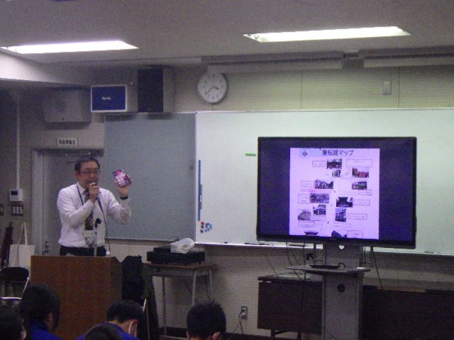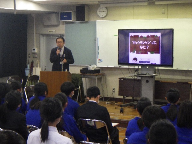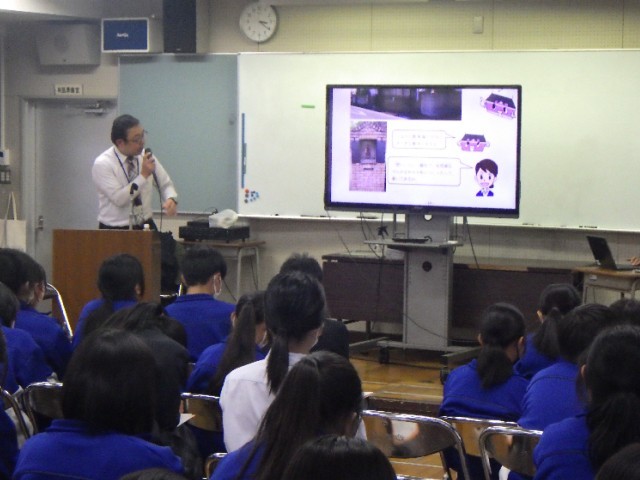 12月2日(火)の6校時に1年総合の「桐生学習」として市の出前講座で「重伝建」についての講義を受けました。講師として桐生市産業経済部日本遺産活用室の小倉甚様にお越しいただきました。小倉さんの説明を聞き、身近なところに沢山の歴史的建造物があることを再確認できたとともに、細かいところに目を向けるとより深く学ぶことができました。この地区は歴史や文化が色濃く残り、歴史的建造物とそれらを活かす街作りを実行してきたこと、美しい景観を保護してきたこと等、いろいろな方々の思いが込められた保存地区なのだということがわかりました。生徒たちは1つ1つの資料や「重伝建マップ」に目を通しながら、真剣に説明を聞いていました。いよいよ来週は実際に「重伝建」を歩き、ガイドさんの説明を受けながら見て触れて感じる体験をする予定です。貴重な体験ができると思いますので、楽しみにしてほしいと思います。