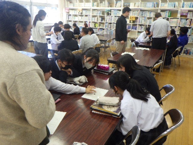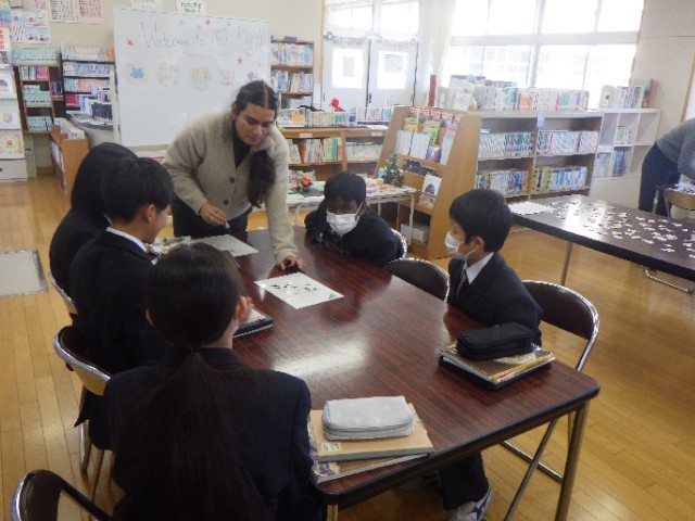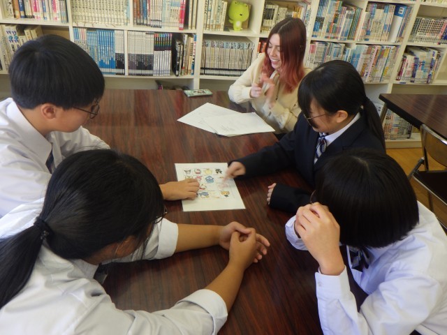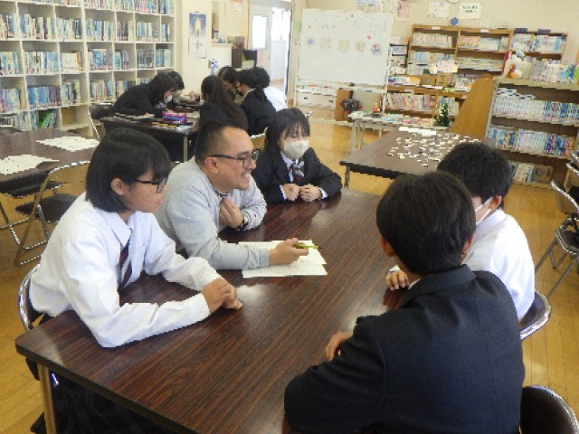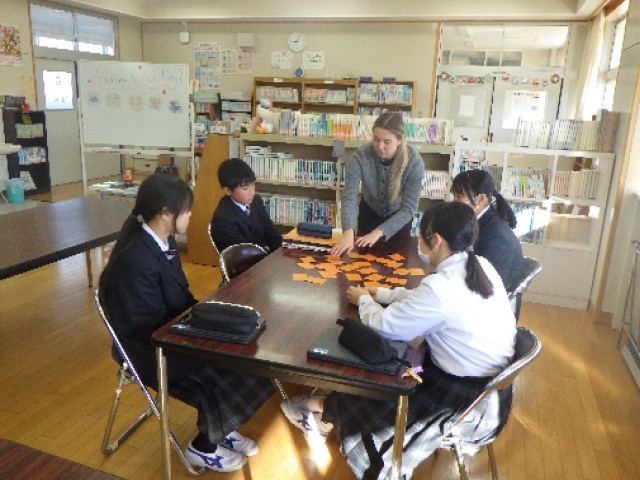 12月15日(月)1〜4校時に市内ALT4名をお招きし、1年生の英語の授業でALTとの交流授業を行いました。英語を使い神経衰弱やBINGO、Picture drawing、Categories、Character quizなどの活動を行いました。生徒たちは意欲的に学習に取り組み、大いに盛り上がりました。ALTの先生と英語で交流し自分の英語が通じたときは嬉しそうでした。今後の英語の授業に今日の経験を生かしてほしいと思います。市内4名のALTの皆様ありがとうございました。