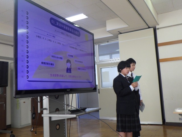 12月16日(火)5校時、学校保健委員会を行いました。学校医の疋田先生(内科)、学校歯科医の久保先生、学校薬剤師の新井先生、PTA会長様、PTA保健体育委員の皆様にお越しいただきました。今年度は、清流中学校の課題である「目の健康」について、生徒保健委員会で行ってきた取り組みを学校医の先生方やPTAの保護者の皆さんの前で発表しました。会の後半では、学校医、保護者、教員、生徒が4つの班に別れてのグループワークを行い、「目の健康」についての課題や解決のために必要なことについて意見交換を行いました。普段の生活で、私たちは寝る前に暗いところでスマホを見てしまったり、長時間ゲームをしてしまったり、目に良くないことをしてしまっています。スマホは便利だが使い方に気をつけないといけないと生徒も保護者も先生方もそれぞれの立場で考えさせられました。今回保健委員会がまとめてくれたことや校医の先生方からご指導いただいたことを全校生徒へ広めていき、多くの生徒が目を大切にする行動を意識してほしいと思います。
