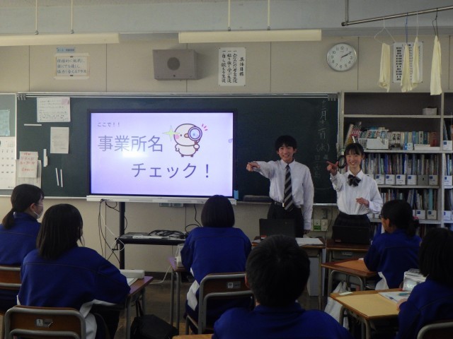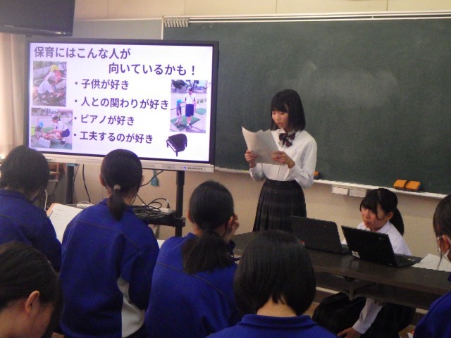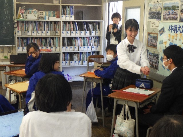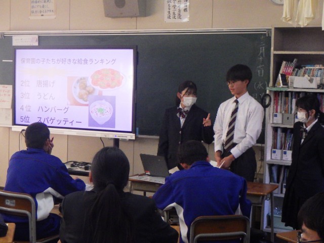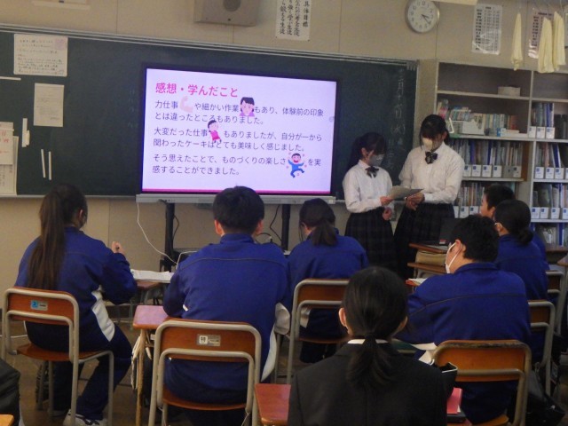 12月17日(水)の5、6校時に2年生が職場体験学習の報告会を行いました。2年生は9月29日、30日の2日間実施した職場体験学習について、学んだことや体験した内容、事業所の方々にインタビューした内容等を発表用資料にまとめ、1年生に向けて発表しました。2年生は1年生に分かりやすく伝えるためにパワーポイントに写真や映像資料を入れたり、クイズを取り入れたりと工夫していました。制限時間内に伝えられるように話すスピードや声の大きさに注意し、ジェスチャーを入れるなど伝え方も工夫していました。1年生は2年生の発表を真剣に聞き、気になることを質問する姿も見られました。1年生はこれからの進路学習で将来の夢や興味のある職業等を考えていきます。今回の報告会を来年の職場体験学習に繋げてほしいと思います。