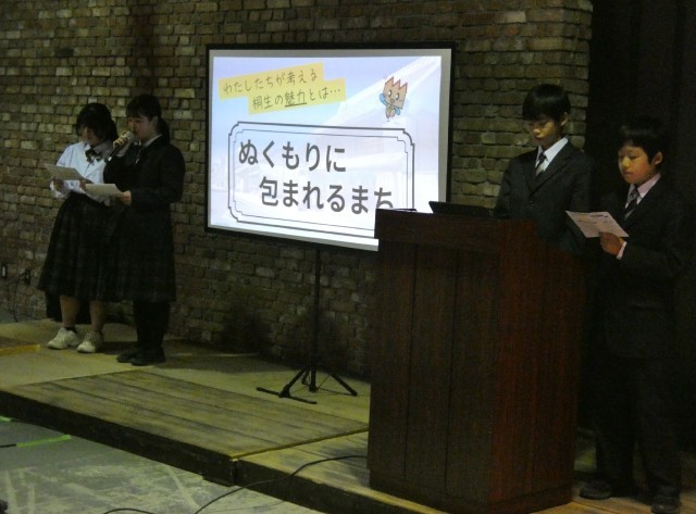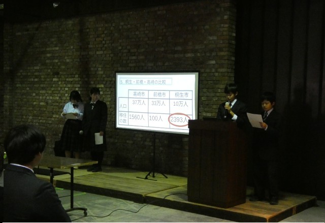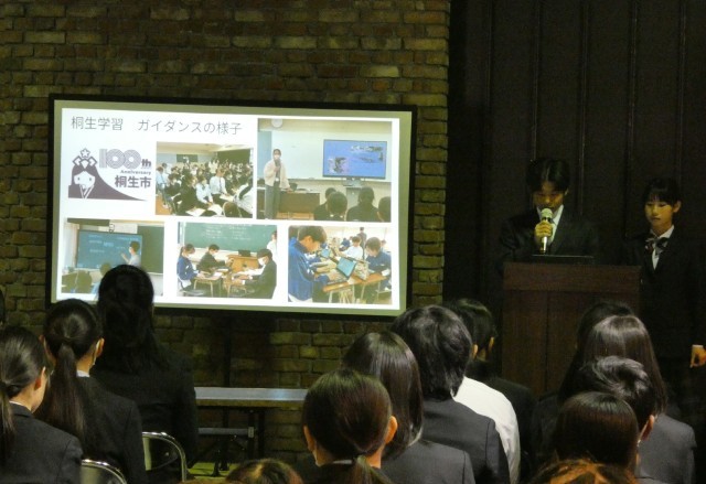 3月11日(水)5、6校時、1年総合「桐生学習」の一環で、桐生市長荒木恵司様の講演を聞きました。会場は有鄰館で行いました。講演の前に、生徒たちこれまで学習してきた成果を発表しました。生徒たちは、私たちの街「桐生」を知ること、「桐生」の良さや魅力を伝えていくために自分たちにできること等を考えてきました。生徒たちの発表は、学習したことを分かりやすくまとめ、自分たちにできることや自分たちの考えを素直な言葉で表現し、どれも素晴らしい発表でした。荒木市長様やこれまで学習に関わってくださった方々にも聞いていただきました。市長様のご講演も桐生の現状と課題に触れ、桐生の魅力発信の取組や子どもから高齢者まで住みやすい街にするという思いが込められていました。最後に生徒たちに「『郷土愛』と『自治意識』を大切にしてほしい」という言葉が伝えられました。会場も歴史的建造物の有鄰館という場所で行い、発表会の準備や運営も代表生徒たち行うなど生徒主体で発表会を実現することができ、大変有意義な時間となりました。