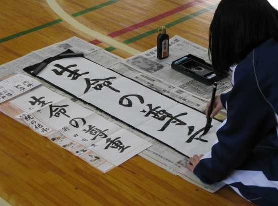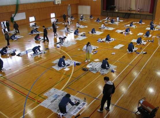 1月8日(木)3学期の始業式後、全校で書き初め大会を行いました。1年生は「新たな決意」2年生は「生命の尊重」3年生は「友好の精神」の文字を課題に取り組みました。各学年の生徒は2学期から国語の時間や冬休みを使って練習を重ねてきました。どの生徒も一字一字、一画一画、集中して丁寧に書き進めていました。出来上がった作品は各学年の廊下に掲示しています。今年も「新たな決意」をもって、学校生活を充実させていってほしいと思います。