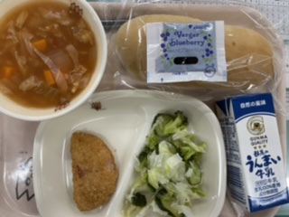 コッペパン、牛乳、マヨエッグフライ、グリーンサラダ、ミネストローネ、ブルーベリージャム